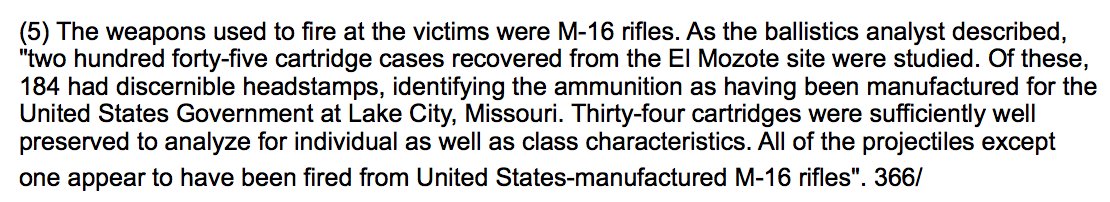 3. This isn't new information, just a new court proceeding. The US-backed Salvadoran government's use of bullets made in Lake City, Missouri (and M16s also made in the US) to massacre 800 peasants in 1981 was described in a 1993 UN Truth Commission report.