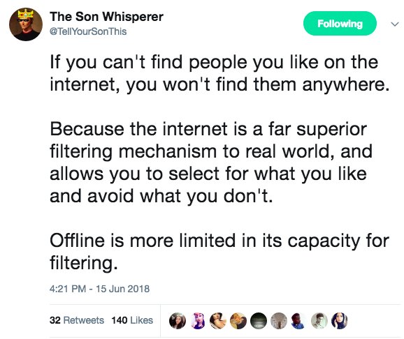 The people I've met online are far smarter, interesting, ambitious and all-around successful that just about everyone I've known offline