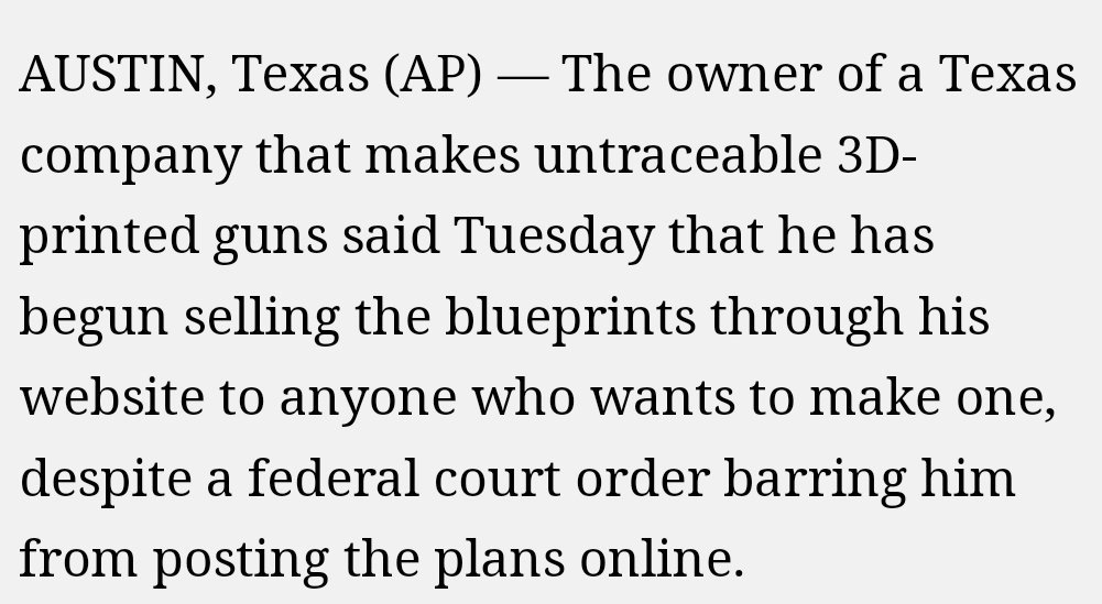 Defense Distributed doesn't make any 3D-printed guns. You can't buy any guns at all from Defense Distributed. You can only buy blueprint files... Files they've long tried to give away for free on the internet. Also, this isn't despite the ruling or in opposition to it.