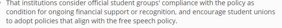 2/ The big "free speech" issues of the last couple of years have to do with external guests to campus. Nothing in this policy compels institutions to accept speakers they don;t want to accept. So if they choose not to permit Faith Goldy or whoever to speak, that's still cool.