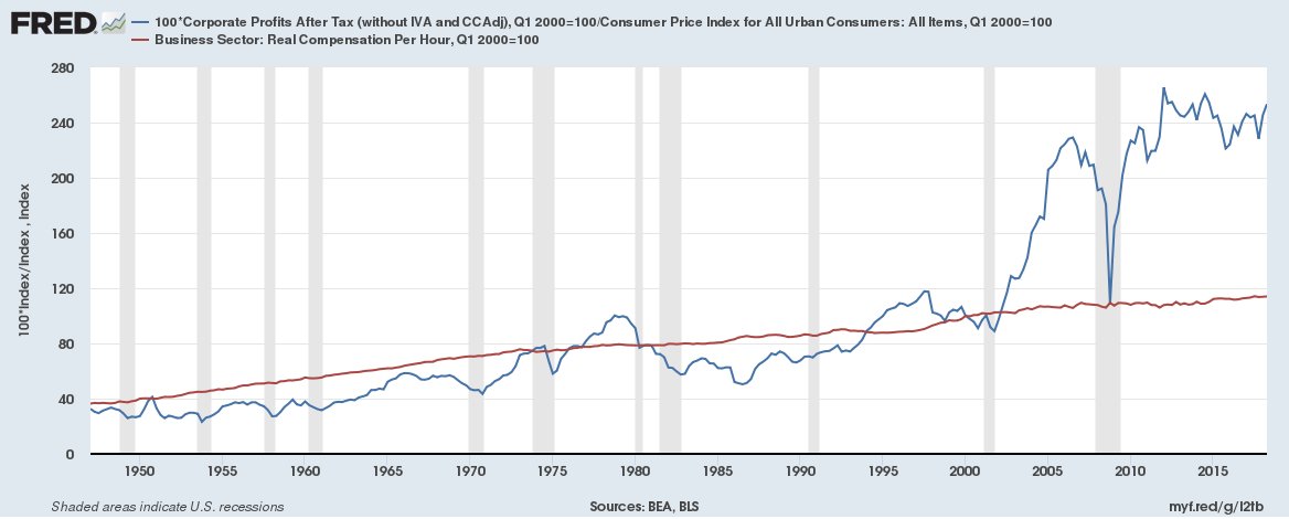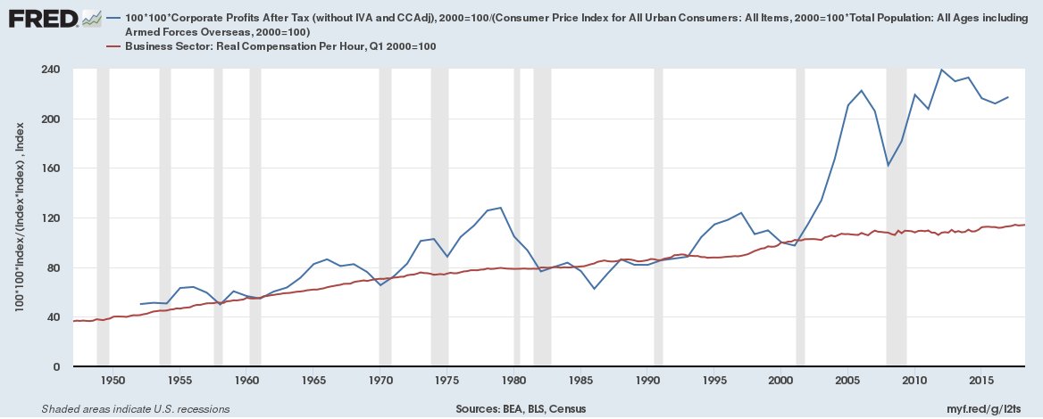 You can see that the ratio of per capita profits to hourly compensation is about 70% higher in the "new normal".