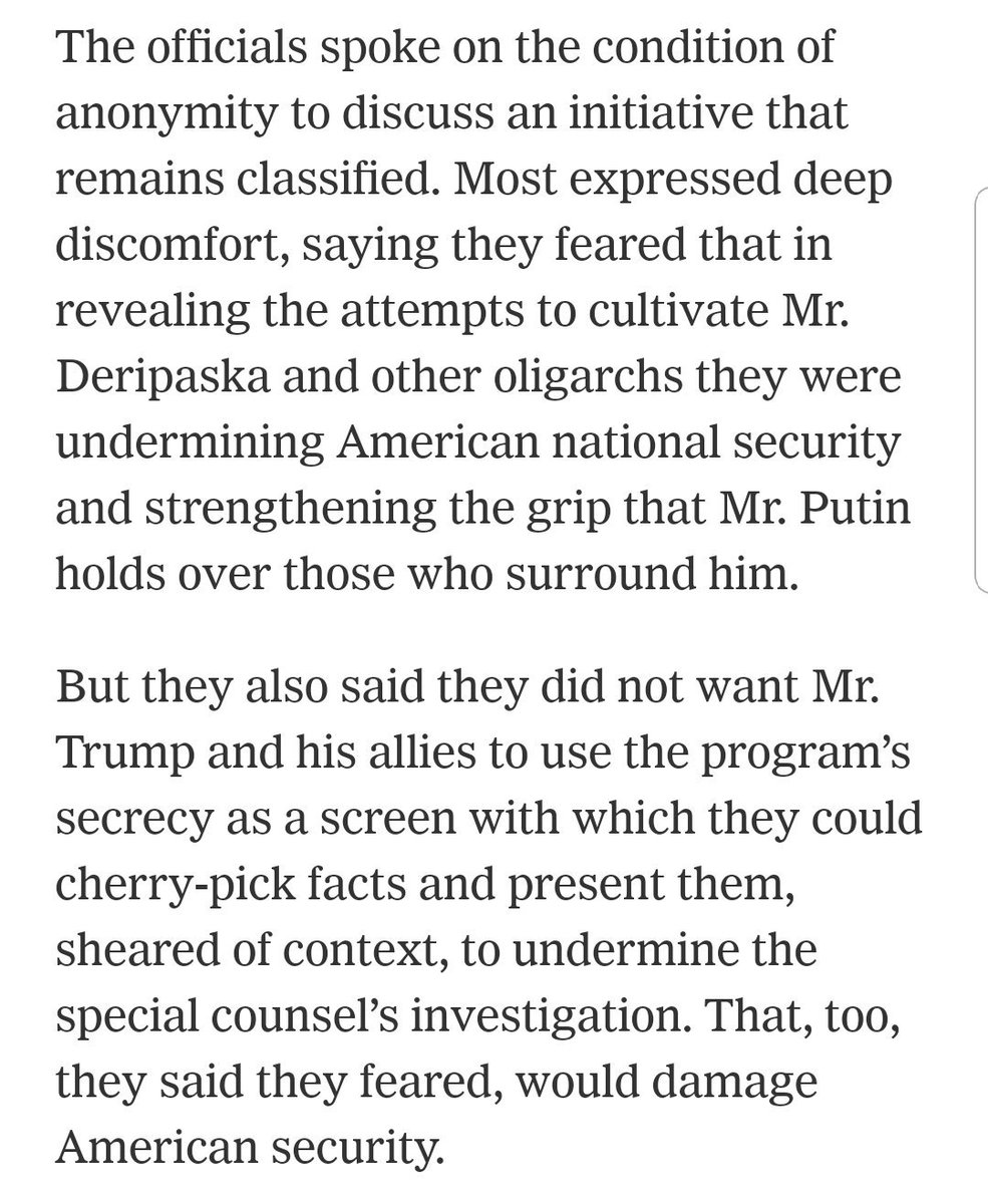 The possibility that this @NYTimes story on the FBI trying to turn Putinist oligarchs is misinformation to cover missteps with Steele in 2016 is almost more comforting. Because the plan as described seems designed to allow Russian spies to play games with the U.S. Intel system.