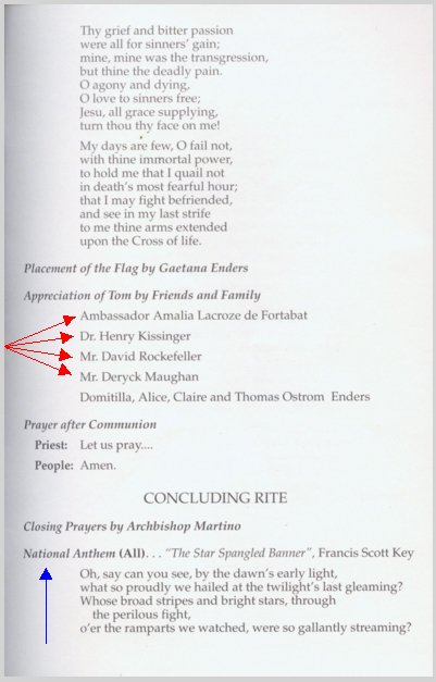As @MollieOReilly points out, you can see at the bottom of this page that after Kissinger spoke at the funeral of his fellow war criminal Thomas Enders, the service concluded with everyone singing The Star-Spangled Banner.