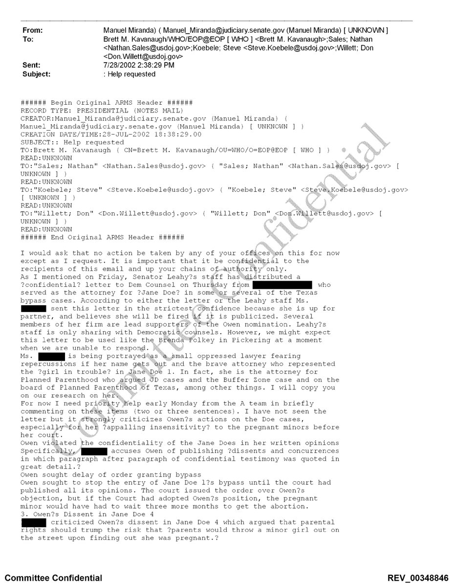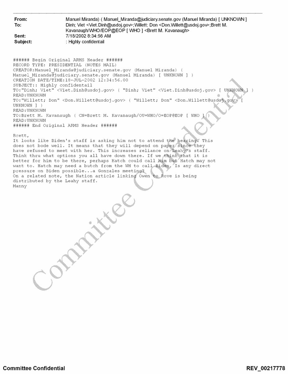 BREAKING: Kavanaugh testified he never received any docs that even “appeared to … have been drafted or prepared by Democratic staff.” Well, he got 8 pages of material taken VERBATIM from my files, obviously written by Dem staff, LABELED “not [for] distribution”.