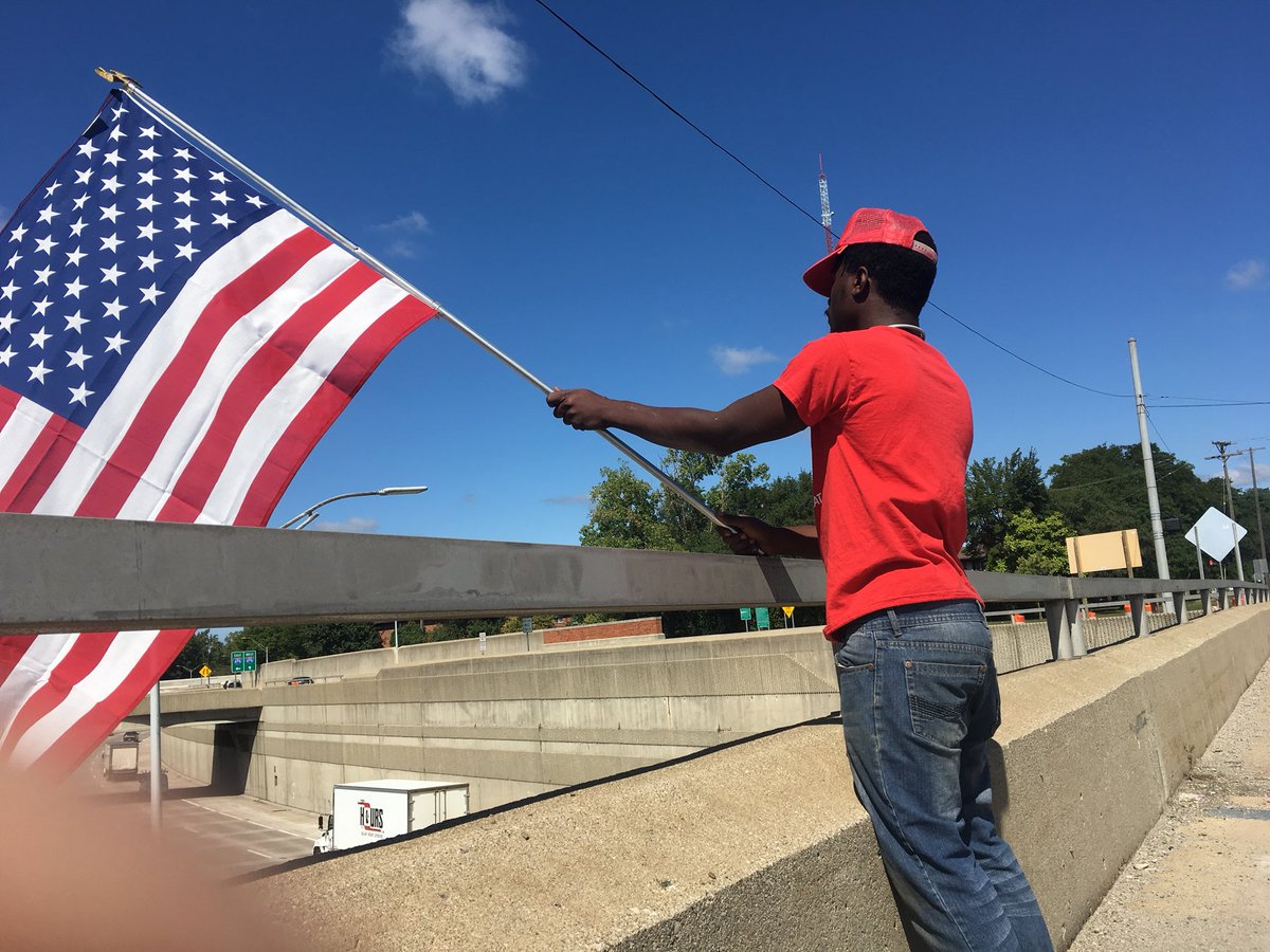 As I was headed back to work from lunch today I spotted this solitary figure standing on the freeway overpass at Greenfield and 696 in Oak Park, waving an American flag at motorists. Being a nosy reporter I stopped to ask what prompted him to do this...