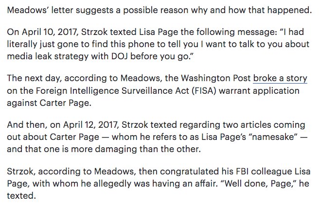 Still no correction/retraction on this @jsolomonReports piece regurgitating Mark Meadows’ bogus narrative on FBI texts. Meadows has now admitted the “Well done, Page” text wasn’t sent until 4/22/2017, the day NYT ran its big Comey story.