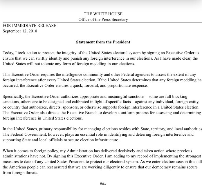 Here's the text of the @POTUS message to Congress on the executive order on election interference and accompanying news release.