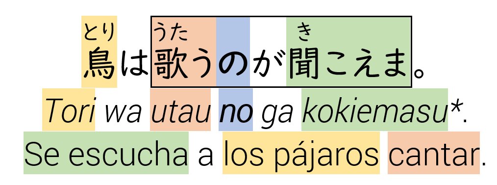 A parte de con の , la nominalización también se realiza con こと, esto depende del verbo, las partículas,... Ya veremos la nominalización con más detalle en otro hilo.