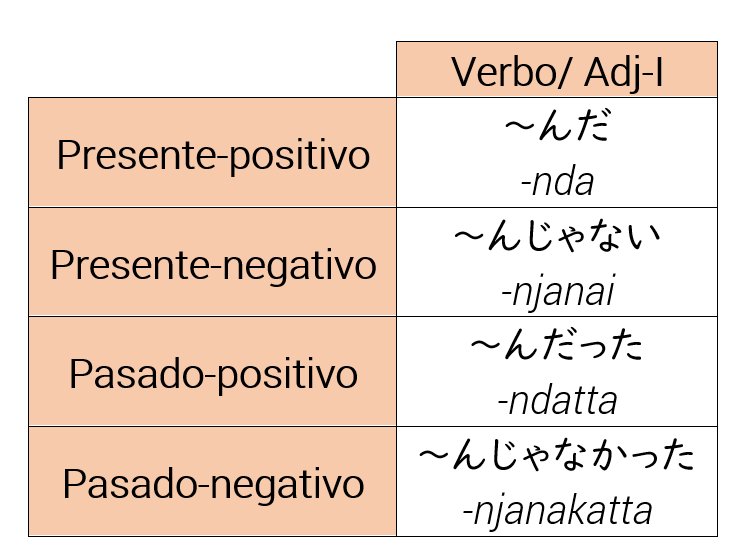 Dato fonético: ~のだ suele usarse mucho, por eso es muy común en el lenguaje oral sustituirlo por ~んだ (-nda) porque resulta más fácil de pronunciar y finalmente, para rizar más el rizo, ~んだ se conjuga como un verbo o adjetivo normal, por ejemplo: