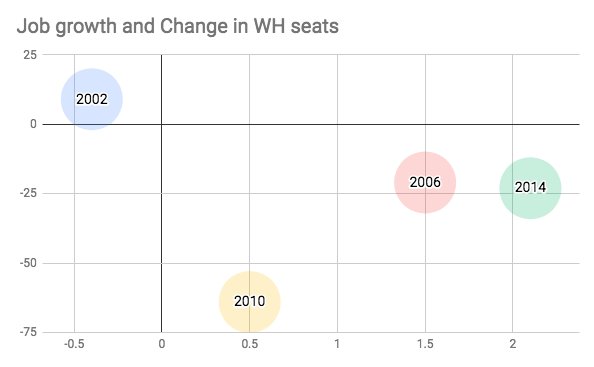 Here's job growth versus change in seats held by the president's party in the past 4 midterms: raw correlation is actually negative, which doesn't mean much, but certainly no strong relationship 3/