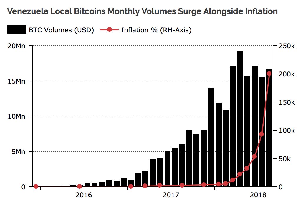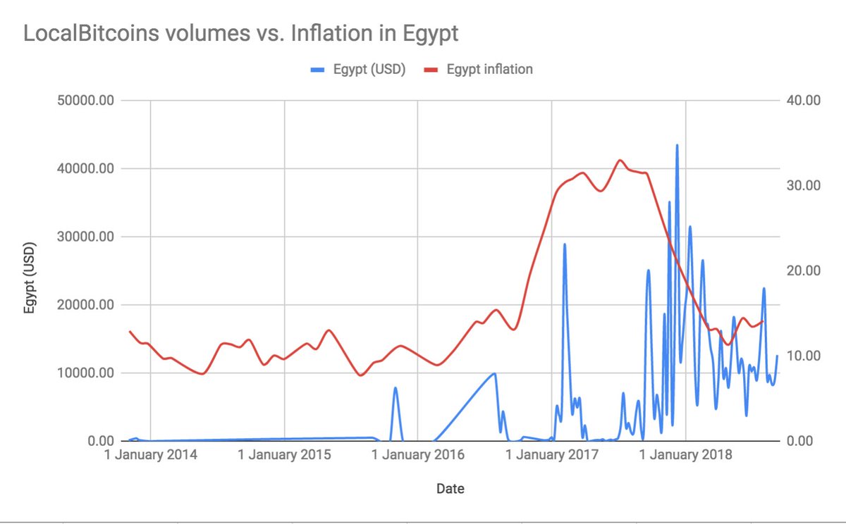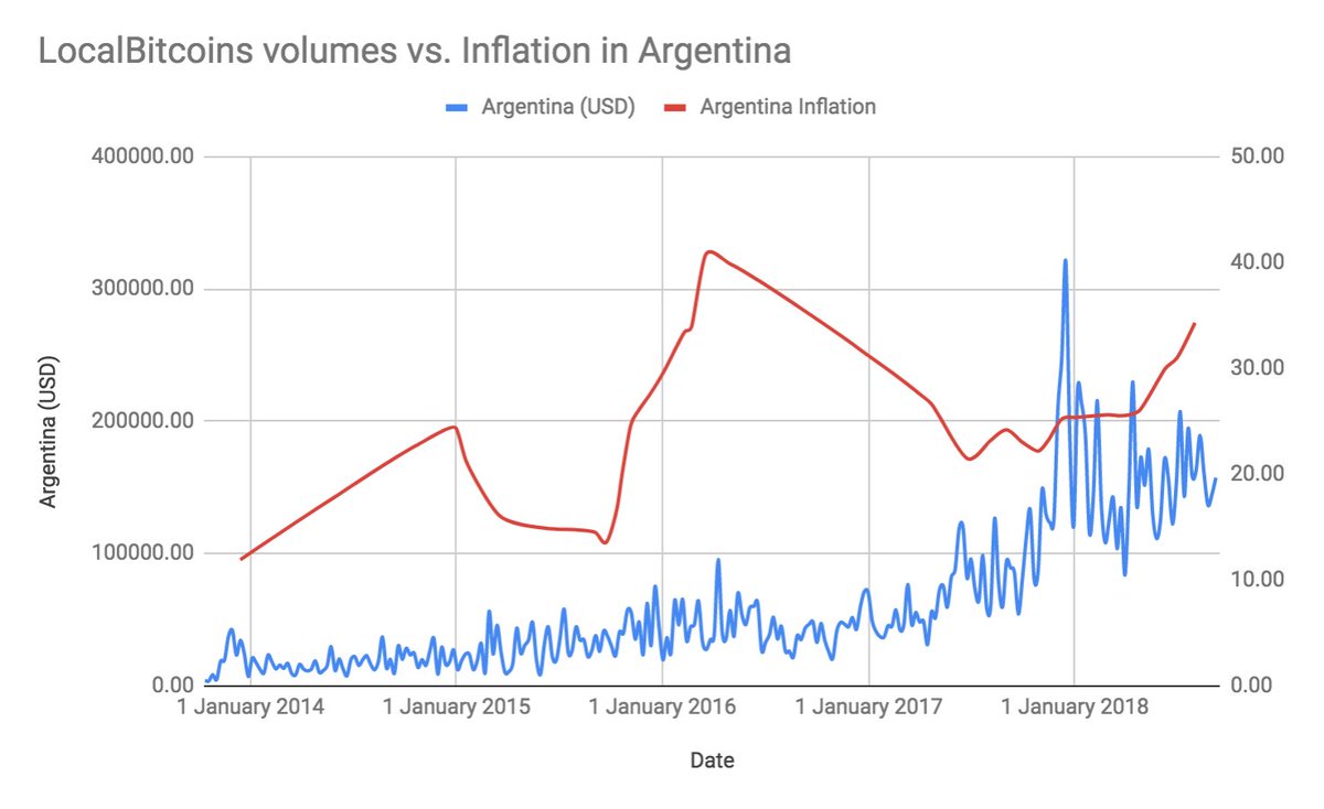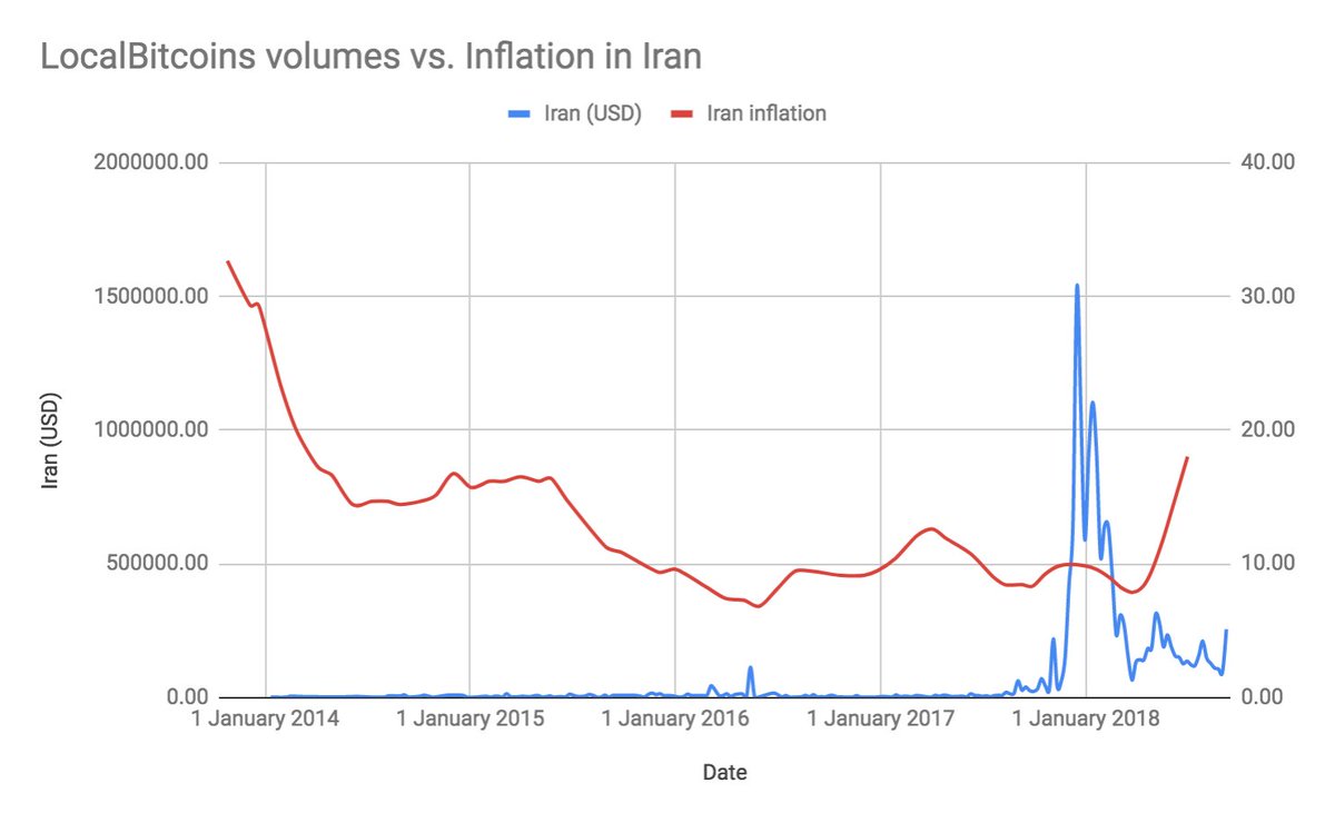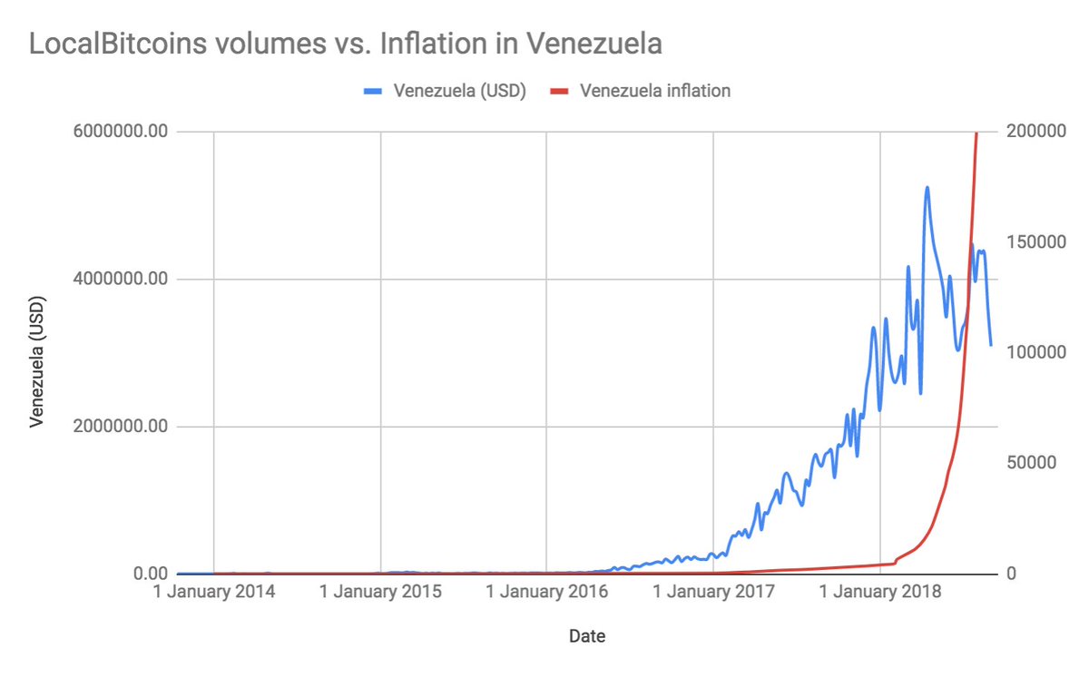 12/ While Bitcoin has been a valuable inflation hedge in countries with unpredictable monetary policy, Venezuela is the first country where there is a considerable growth in traded volumes with the increased inflation. This suggests that bitcoin is actually helping people there.