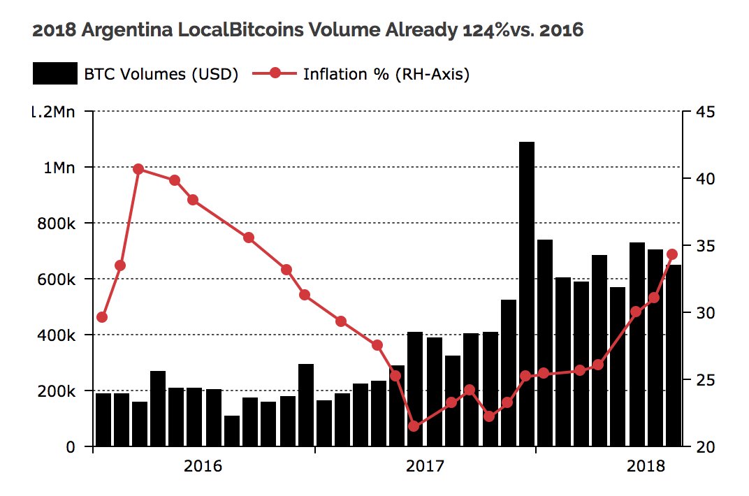 5/ The volumes denominated in USD graphed with the inflation rate paint a very clear picture. In November 2016 when the national currency first became hyperinflationary, the weekly volume on LocalBitcoins grew from $230,000 to about $3.1Mn today (1250% increase).