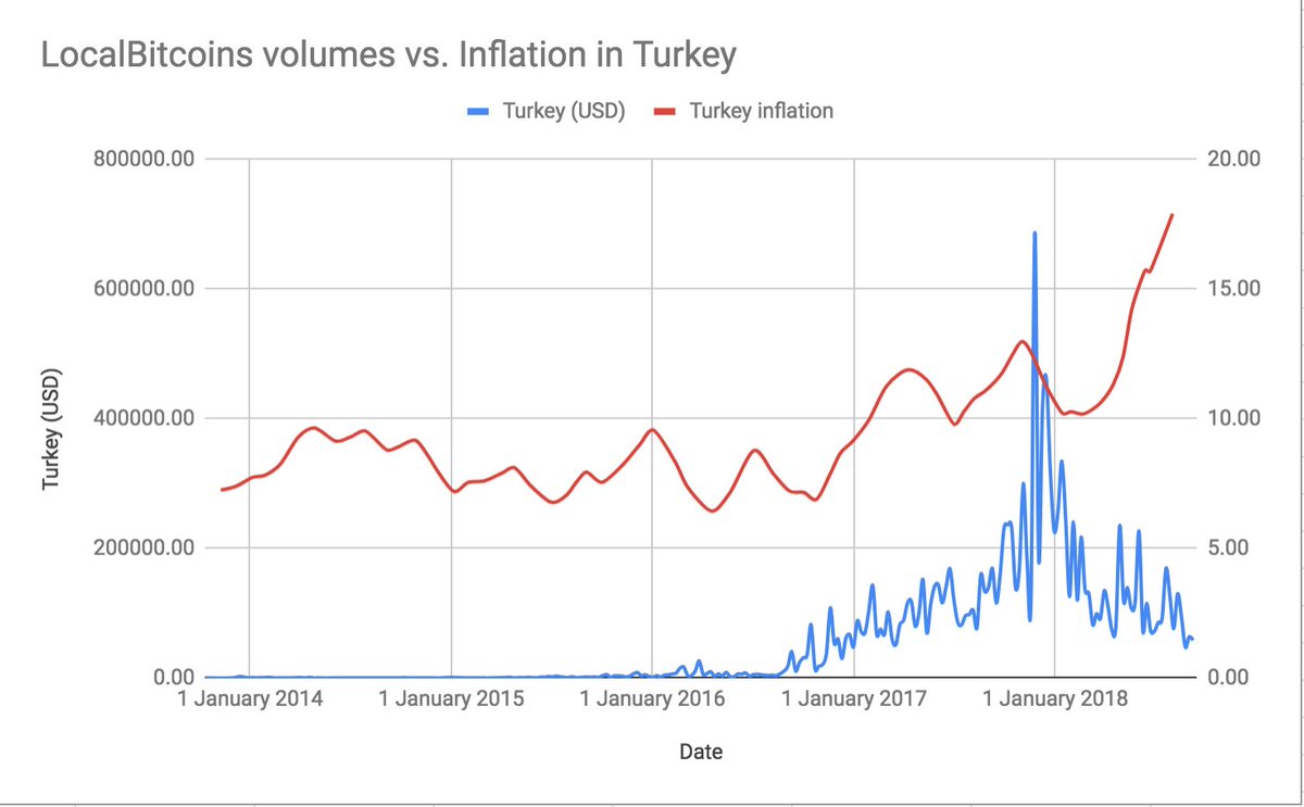 9/ Turkey has also been battling increasing inflation for the past two years. Inflation increased from 6% in April 2016 to nearly 18% today. However, despite the short bursts of interest, LocalBitcoins volumes have continued to slide. Perhaps because trading is legal in Turkey.