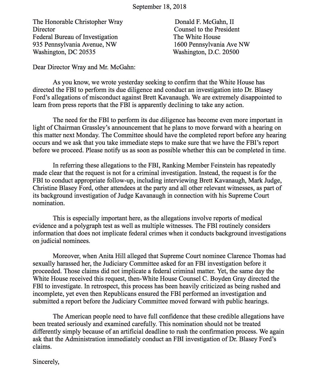 Along with my Democratic colleagues on the Judiciary Commitee, I'm urging a FBI investigation and asking Chairman Grassley to allow the Committee to perform its due diligence and find a fair path forward that treats these allegations with the respect that is required.
