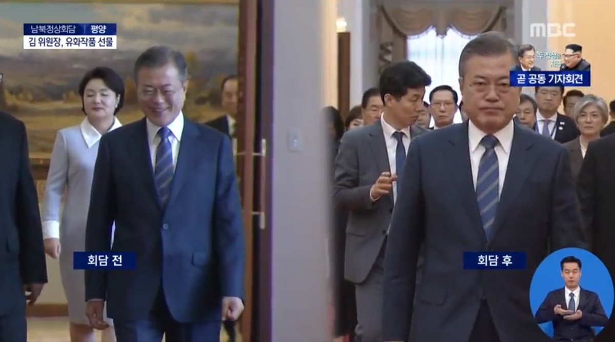 This is before and after. Moon was beaming before the talk. After 70 minutes, his facial expression changed: somber, biting down. Throughout the signing ceremony, Moon was stony faced, even gloomy