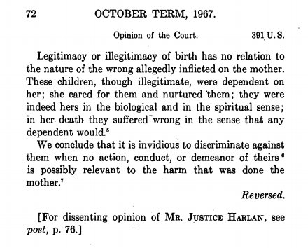 If there's a competition for the shortest SCOTUS opinion striking down a law as unconstitutional, I would think Levy v. Louisiana, 391 US 68 (1968) (Douglas, J.), is in the running. Total opinion length in US Reports: about 3.5 pages. Analysis: <2 pages. cdn.loc.gov/service/ll/usr…