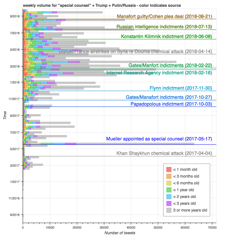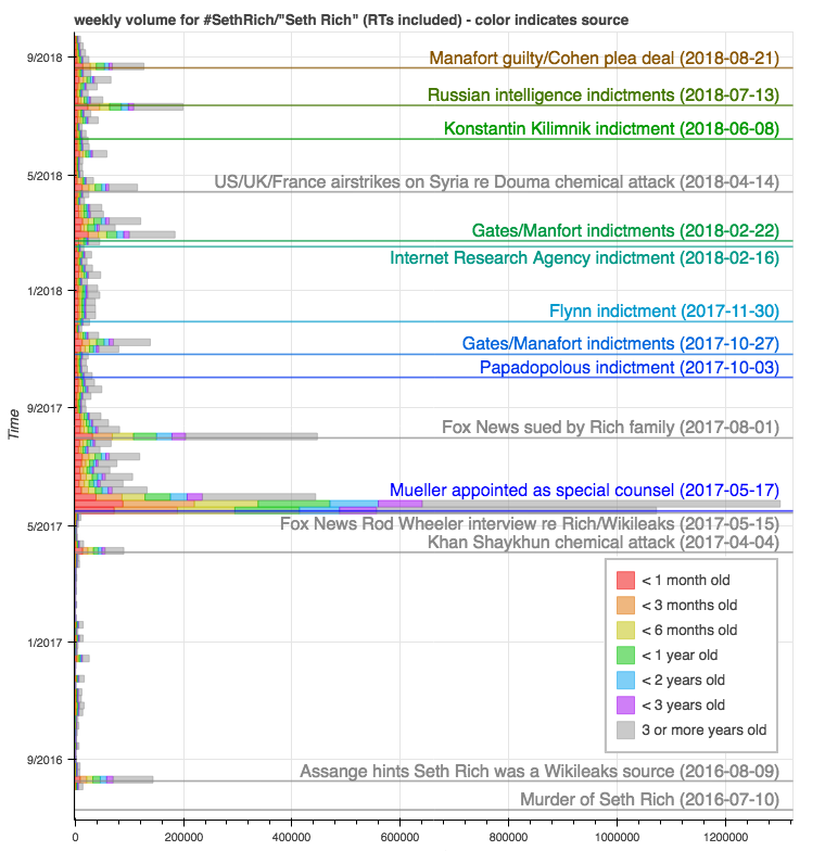 Here is the weekly tweet volume for #SethRich/"Seth Rich", colored by account age and labeled with the dates of several notable events. It's very spiky - and note that several of the spikes correlate with key moments in the Mueller investigation.