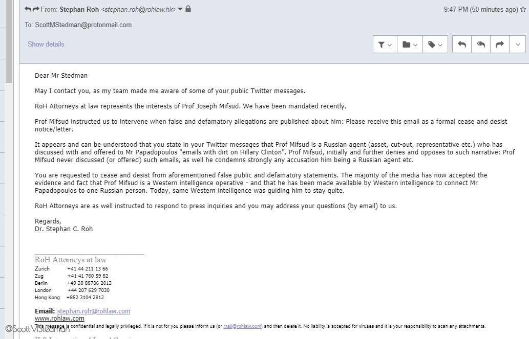 Stephan Roh just emailed me a cease-and-desist demand because of my "false and defamatory allegations" against Joseph Mifsud