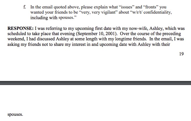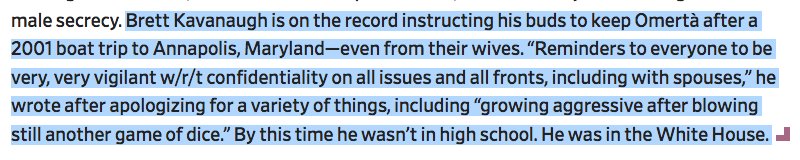 Also, worth noting that Kavanaugh claimed he emailed his bros about being "very, very vigilant w/r/t confidentiality on all issues and all fronts, including with spouses,” after a boat trip because he was just so gosh-darn excited about his first date with his now wife. Hmm.