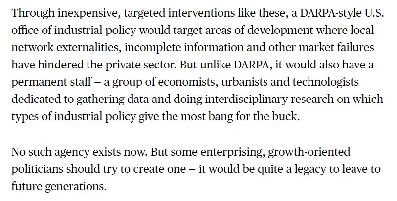 A U.S. Office of Industrial Policy would be a "DARPA for economics", but it would also bring together researchers from various fields in a permanent think tank to find "gaps" in the economy that need filling in.