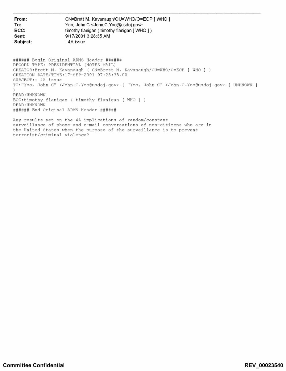 The reality? Ex. 4a: In a 2001 email to John Yoo, BCC’ing Timothy Flanigan, Kavanaugh asks “Any results yet on the 4A [Fourth Amendment] implications of random/constant surveillance of phone and e-mail conversations …?”
