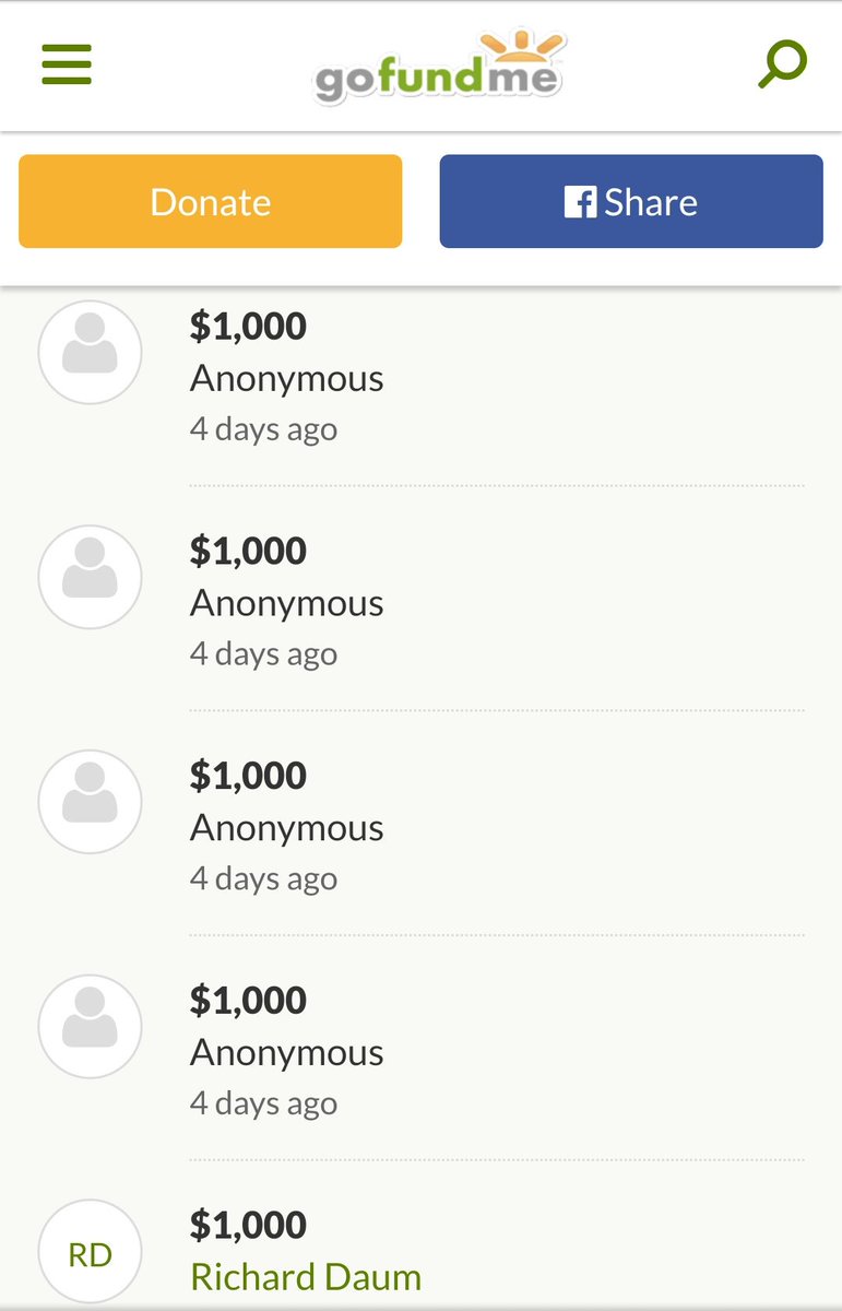 The majority of the largest donors, at $1,000 per donation, are listed as anonymous.