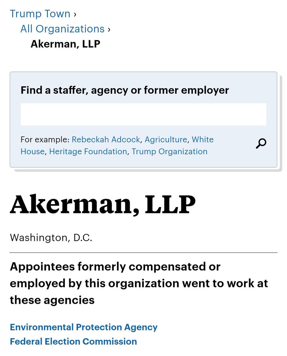 One of the largest donors is Dana Clayton, a Florida real estate lawyer who works for Pro-Trump law firm Akerman, LLP projects.propublica.org/trump-town/org…