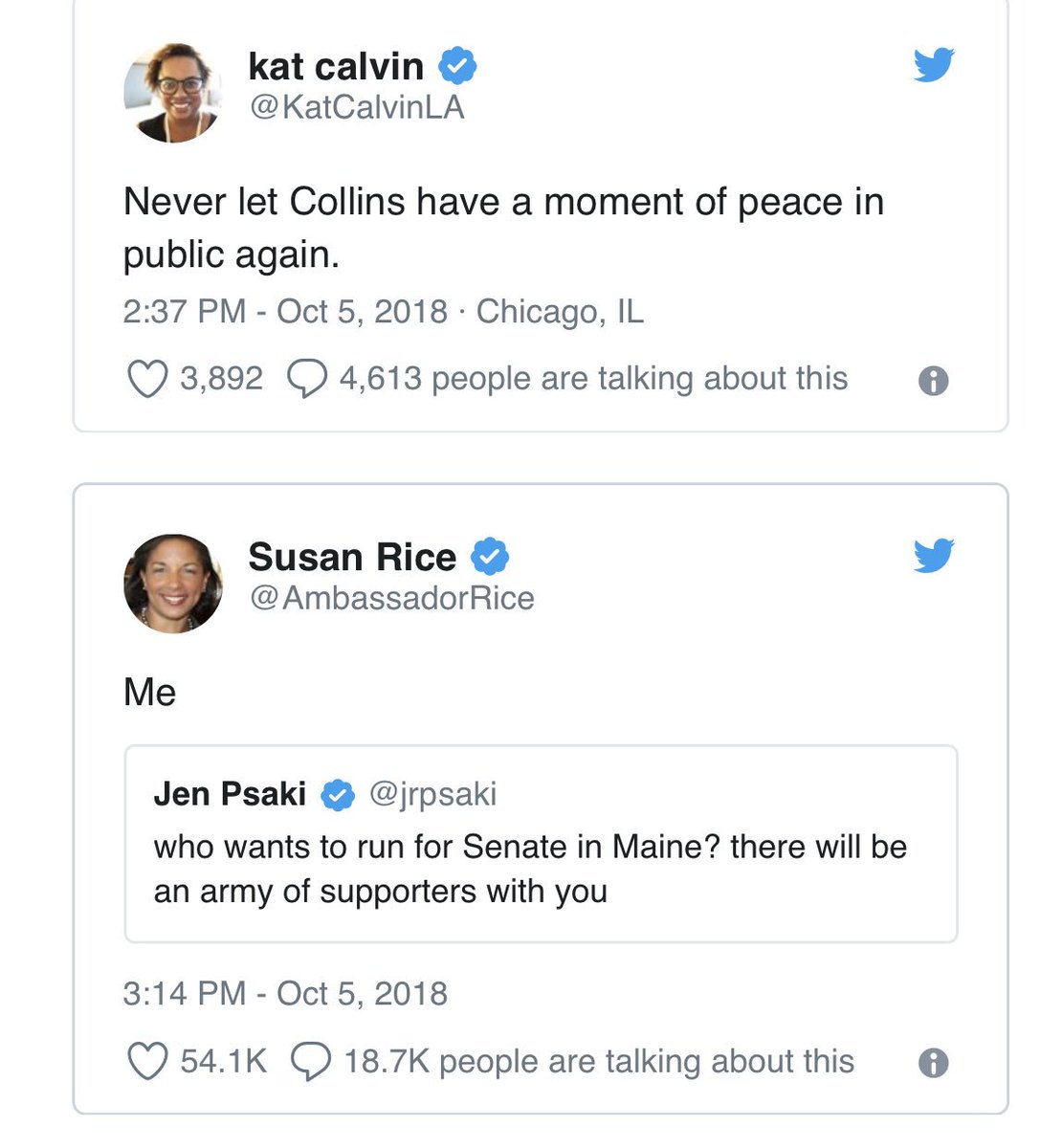 She also doubtless knew that the image of a moderate woman Republican with two other Republican women in-frame would be a strong visual counter to liberal talking points that women are united against Kavanaugh.