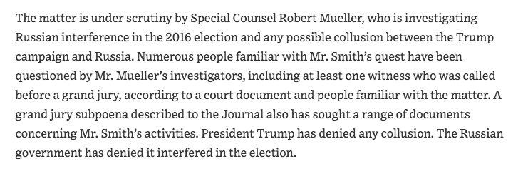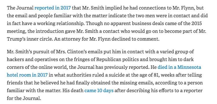Wow. Peter Smith, the veteran GOP operative who attempted to work with Russian hackers to obtain Clinton’s emails in 2016, raised $100,000 to fund this effort and took steps to ensure that it all remained completely secret. wsj.com/articles/gop-o…