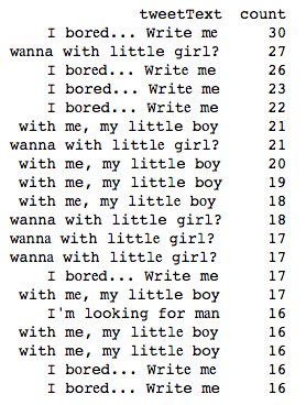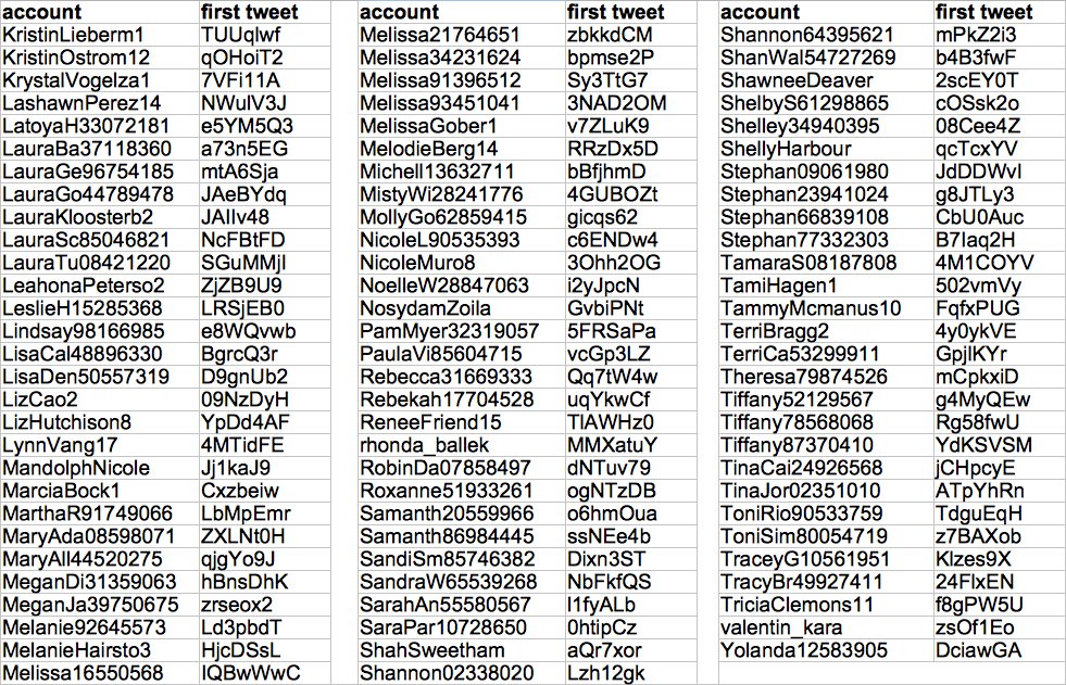We decided to look for more accounts like it. We started by harvesting the recent replies to the accounts that @ShawneeDeaver replied to, and filtering the results to accounts with a 7-character code as their first tweet and all subsequent tweets being quickly-launched replies.