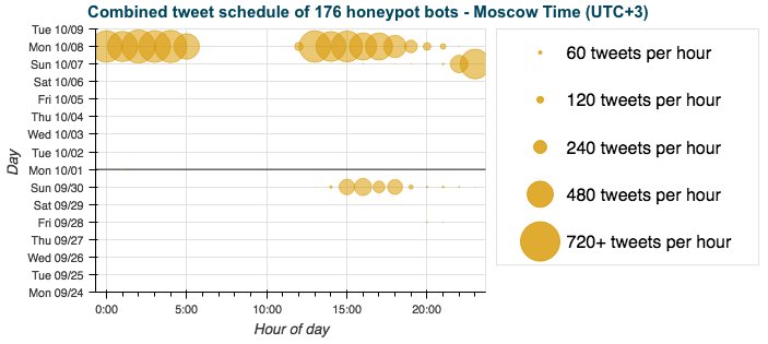 Here is the combined tweet schedule of the 176 accounts. Although all tweets are sent via the Twitter website, due to the repetitive nature of the content and profiles, it's not unlikely that both account creation and tweet posting is automated.