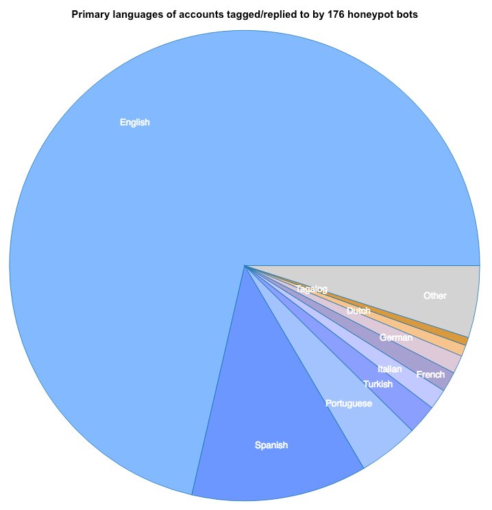 Here's the language breakdown of the accounts targeted with replies by this network. Most are English, with Spanish coming in second. Most (but not all) have 50K or more followers; many are verified accounts.