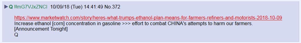 Increase ethanol [corn] concentration in gasoline >>> effort to combat CHINA's attempts to harm our farmers.