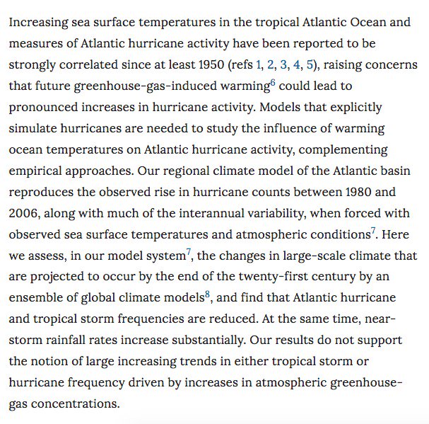 2/ Even more interesting, looking to the future, it could be that global warming means *less* hurricanes. Hurricane formation is a complex process involving multiple factors. A warmer world acts to reduce some of those. Note the 1st sentence here: nature.com/articles/ngeo2…