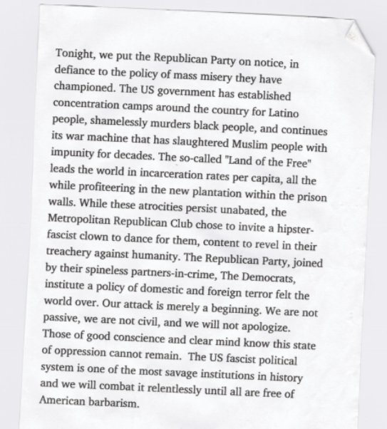 “The Metropolitan Republican Club chose to invite a hipster-fascist clown to dance for them, content to revel in their treachery against humanity,” the note said.