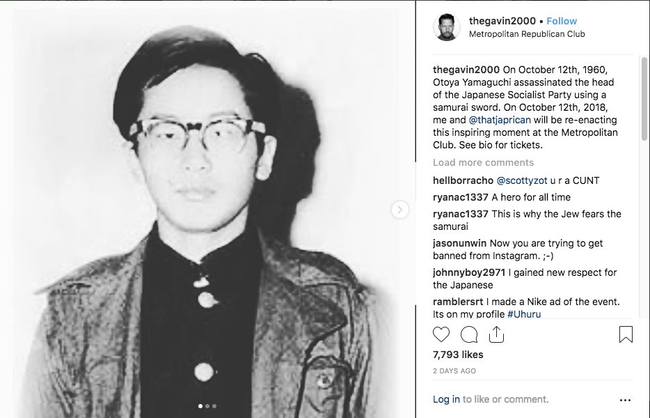 He said he would be "re-enacting" the "inspiring moment" when the head of the Japanese Socialist Party was assassinated by samurai sword.