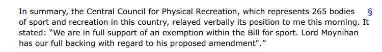 In fact, the Central Council for Physical Recreation, which represented 265 sporting bodies in the UK, wanted an exemption.