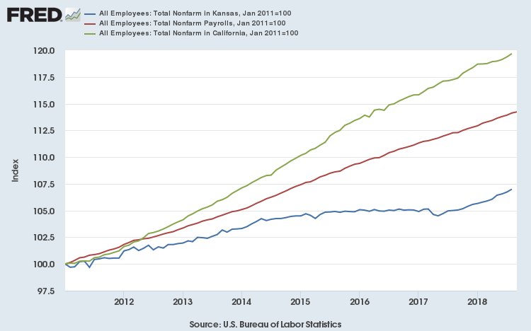 Remember when Sam Brownback promised an economic miracle from the Kansas "experiment" -- his term -- and conservatives declared that Jerry Brown's California was committing "economic suicide" by raising taxes? Um ... 2/