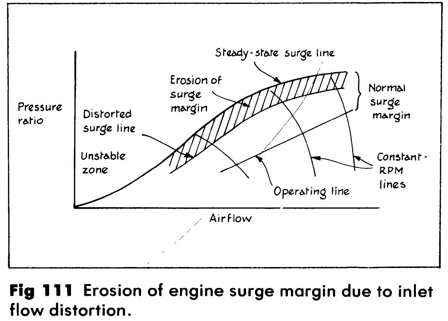 با قرار گرفتن ورودی در چنین وضعیتی، تیغههای کمپرسور مدام از جریانهایی با سرعتهای متفاوت عبور میکنند، که میتواند باعث لرزش تیغهها و صدمه آنها شود. (37)