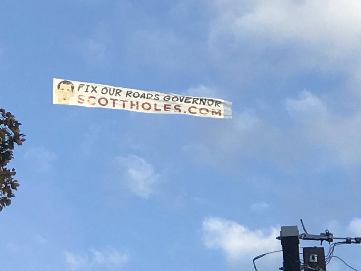 It’s homecoming at UW-Madison, which means this banner is being flown over the stadium. For you non-Wisconsinsites, an explanation: GOP Gov Scott Walker slashed road funding so much that they’re scarred with pits statewide, which are now called “Scottholes.”