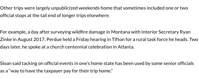 Secretary Perdue's calendars show that he traveled to Georgia 13 times in his first six months on the job. Trips to his home state were also often added on to official events at taxpayer expense: politics.myajc.com/news/state--re…