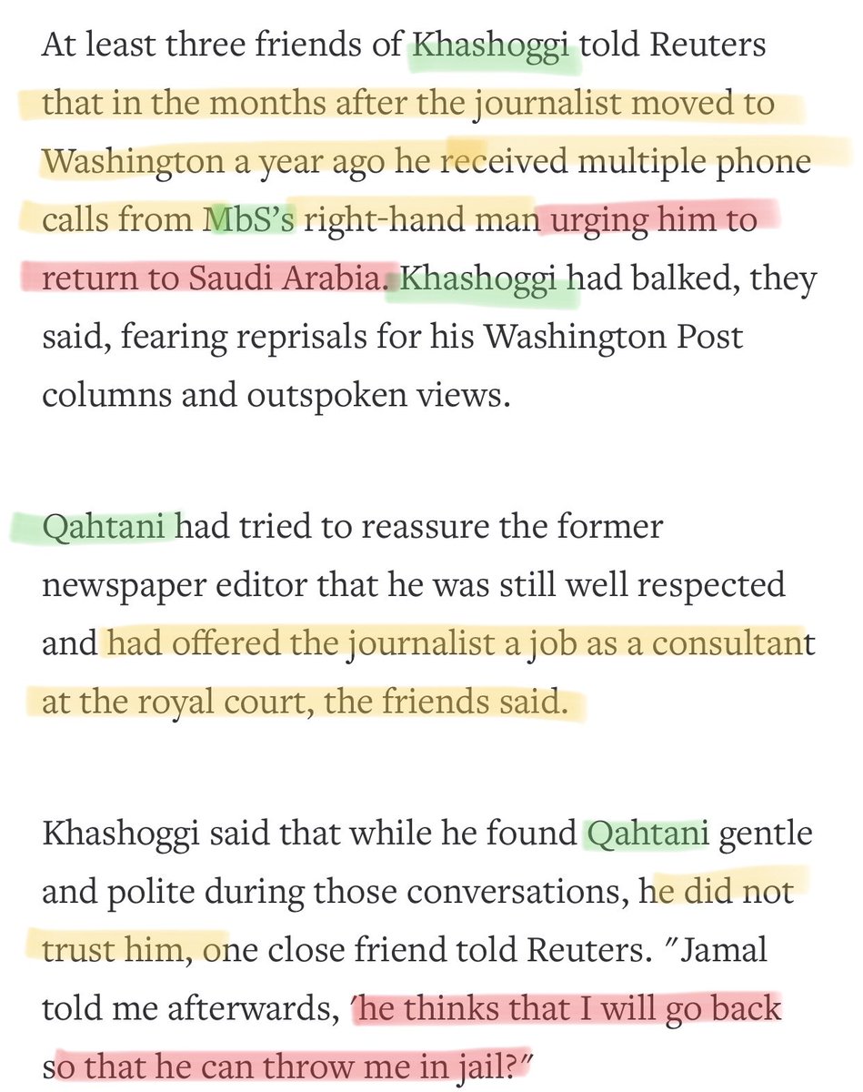 😳Several sources confirm that months before Qahtani called Kashoggi and tried to convince him to move back home and told him he’d have a job w the Royal Court. Khashoggi didn’t trust him and thought he too would be thrown in jail like so many others...