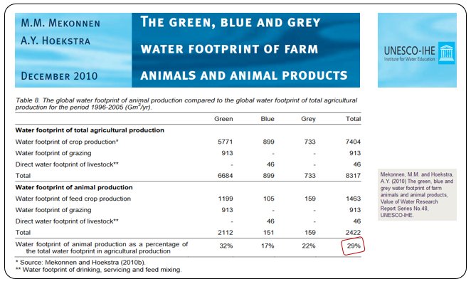 The water footprint of animal production is said to represent 29% of total agricultural production (and is needed for feed production, grazing, and direct use)