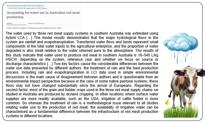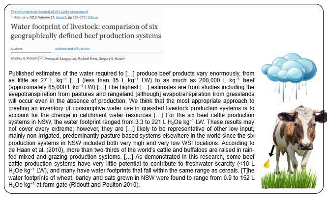 When accounting for green water, LCA estimates for beef raised on predominantly pasture-based systems are 2-221 L/kg LW (~5-500 L/kg beef), which compares to cereal!
