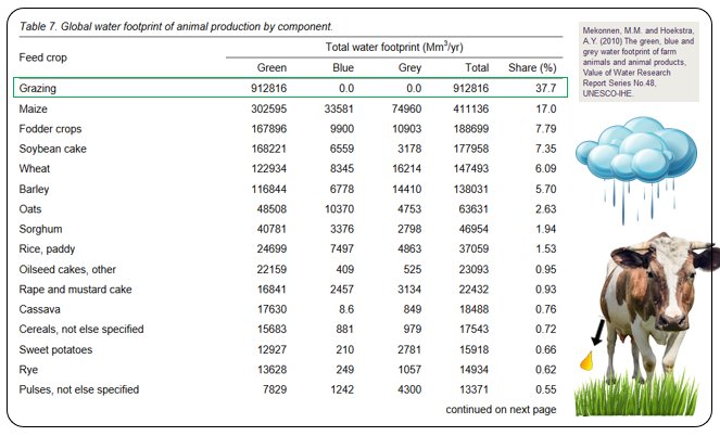 Green water represents no less than 87% of the water used by livestock, and in the case of grazing beef this number even equals 94%.