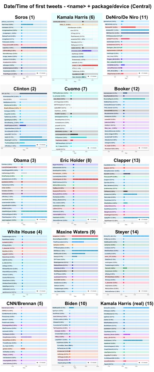 This chart shows the time of first tweet from the first ~20 accounts to tweet about each target. The stories that turned out to be rumors are indicated via a blue background. The erroneous stories spread more slowly than the true ones (with the exception of the White House).