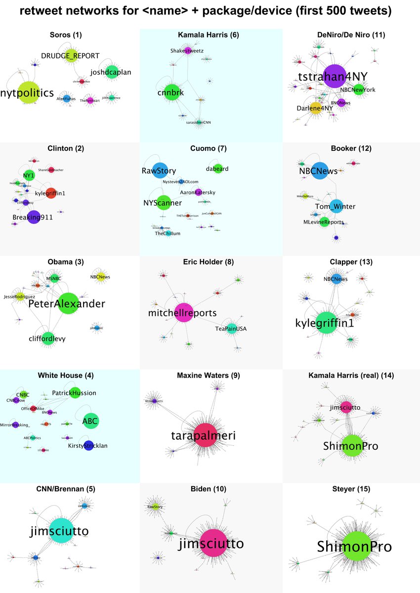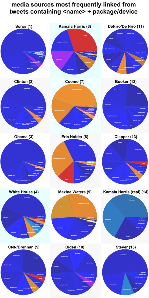 Finally, here are the news sources most frequently linked in Twitter discussion of each bomb/person targeted. Russia Today puts in a major appearance for the first (inaccurate) report of a bomb being sent to Kamala Harris. Gateway Pundit's participation is also interesting. . .