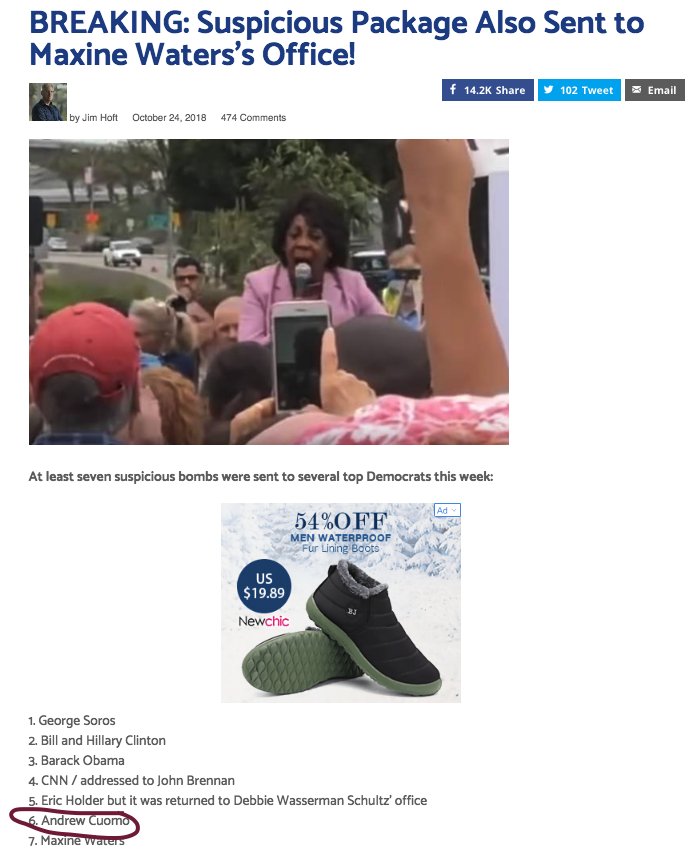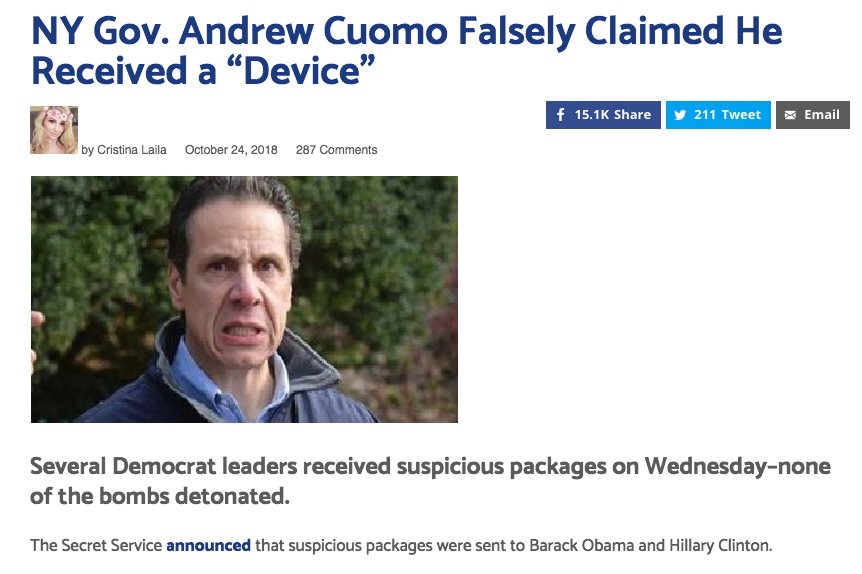 Gateway Pundit jumped on the chance to push the message that Andrew Cuomo had lied about receiving a bomb (he did report receiving a "device", but corrected the claim later). Amusingly, later that same day Gateway Pundit erroneously reported Cuomo as one of the actual targets.