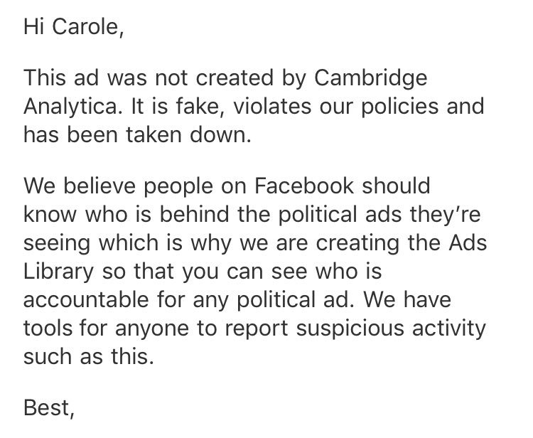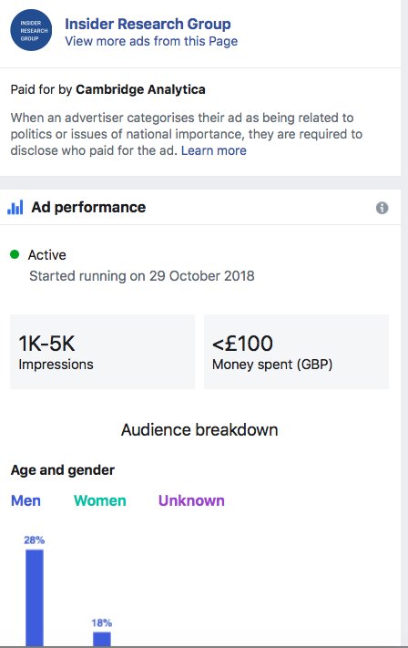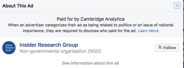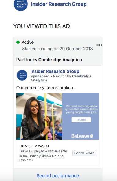 Here's a pro-Brexit advert placed two days ago. It was "paid for by Cambridge Analytica". Posted by "Insider Research Group". And uses an image by the disgraced law-breaking campaign group, BeLeave...