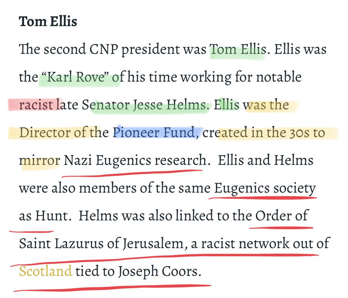 🔥Everyone tied to CNP knows that the origins of the group are tied to Nazis and Eugenics built on the hatred of others. Ask yourself, would you join a group filled w Nazis, racists and Eugenecists?🔥Look at Tom Ellis, CNP’s 2nd President.